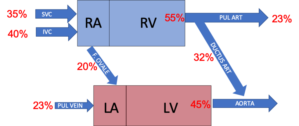 Furthermore, similar happened to venous return where most of the venous return reaches RA but shunted to the left side before reaching pulmonary circulation. Thus the fetal circulation is significantly parallel mixing type of circulation. Thus the output from either ventricle does not signify the cardiac output. So the term Combined Cardiac Output (CVO) used in fetal circulation. The LV contributes around 45% of CVO and RV about 55%. The distribution to the various organ is represented as percentage of CVO.
