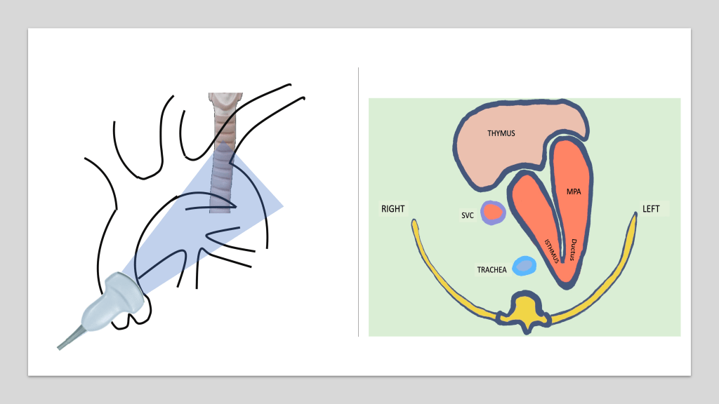 The three vessels and trachea view (3VT) are different from the 3VV view in that it shows even more superior mediastinum and leftward towards the meeting point of the ductus arteriosus and the isthmus. 3VT view again obtained by tilting transducer cephalad from a four-chamber view to demonstrate lv outflow first, then the RV outflow and then with slight left rotation tilting further along the axis of the main pulmonary artery.