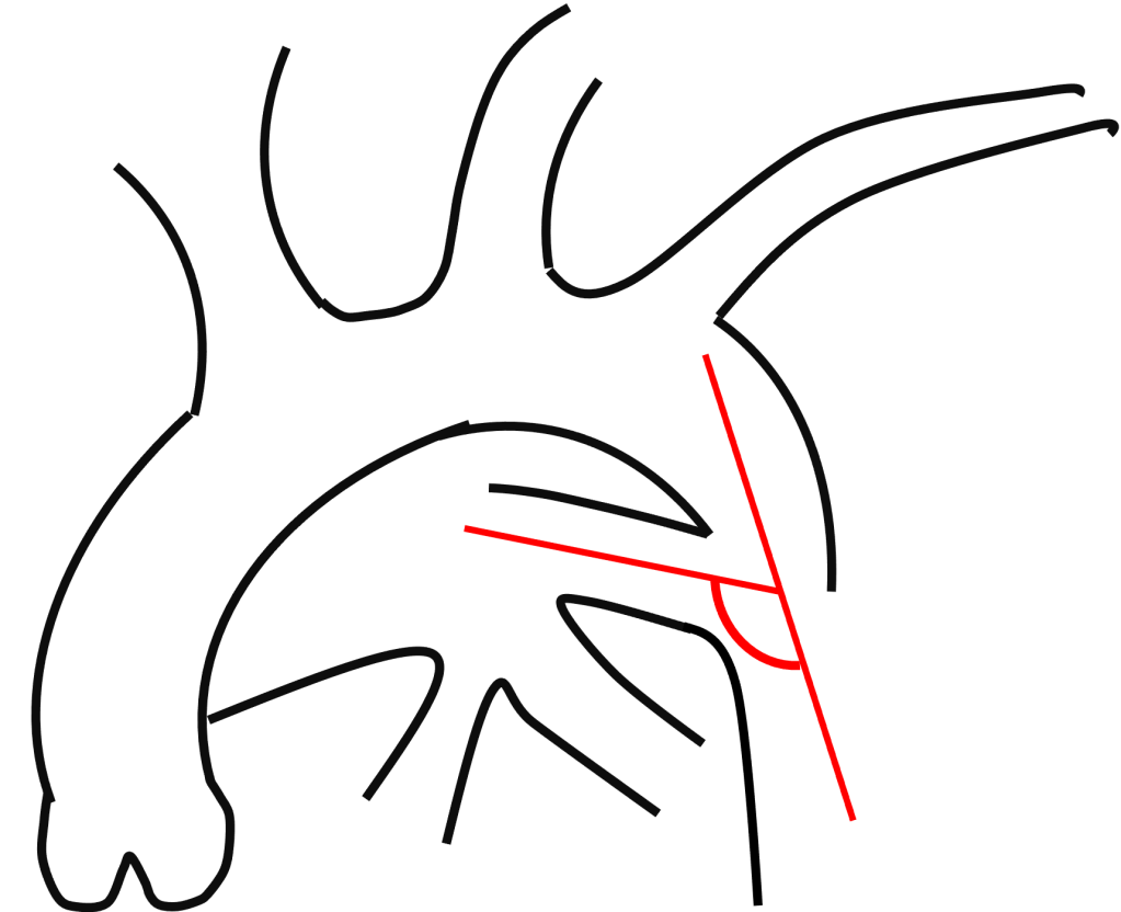 A retrospective study by Toole et al (2015) found an angle of < 125° was 81.8% sensitive and 71.4% specific for having postnatal coarctation and if the cutoff decreased to <117° the specificity increases to 96% but the sensitivity drops to 24%.