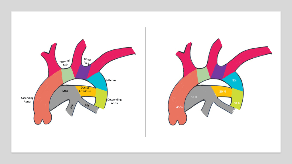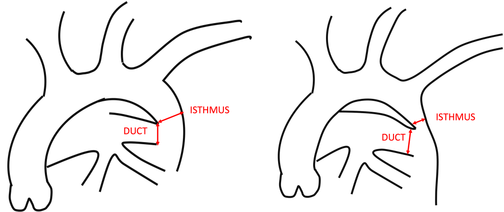 In a fetus, the aortic isthmus receives approximately 8% of the combined ventricular output. If this flow decreases any further, the growth of the aortic isthmus and distal aortic arch get compromised. That can result in significant undergrowth and thus a narrowing of the isthmus.