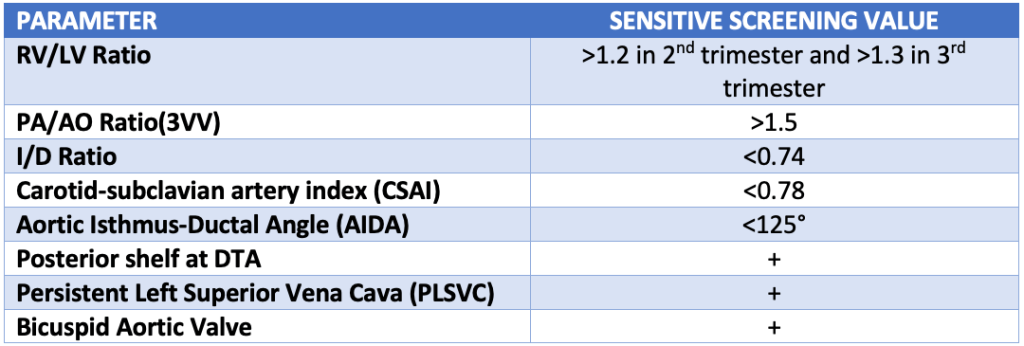 A retrospective study by Toole et al stated that an isthmus to the ductal ratio of <0.64 on any single fetal echocardiogram was nearly 90% sensitive and that <0.5 was 100% specific for postnatal coarctation.