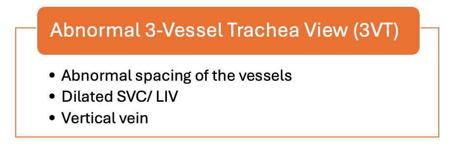 - Initial Screening Views: Use the 4-chamber to track drainage of pulmonary veins, 3VV, and 3VT views.