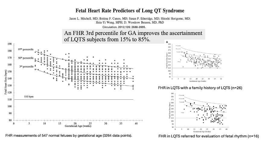 A study by Mitchell et al. established gestational FHR norms in normal fetuses and evaluated baseline FHR in fetuses with long QT syndrome (LQTS).