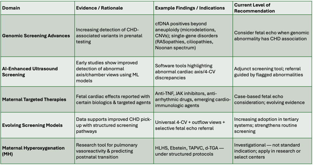 Because universal fetal echocardiography is not yet practical in most settings, referral is guided by specific maternal, fetal, and genetic indications. These recommendations reflect current evidence and major guidelines (ASE 2023, ISUOG 2023, AIUM/ACOG).