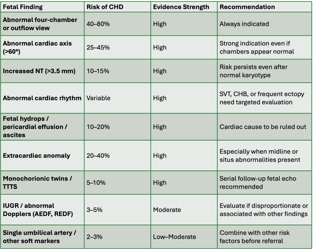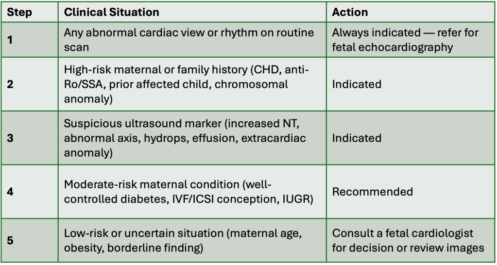 This document presents a concise, evidence-based framework for when to perform fetal echocardiography, along with risk-stratified guidance for clinical practice.