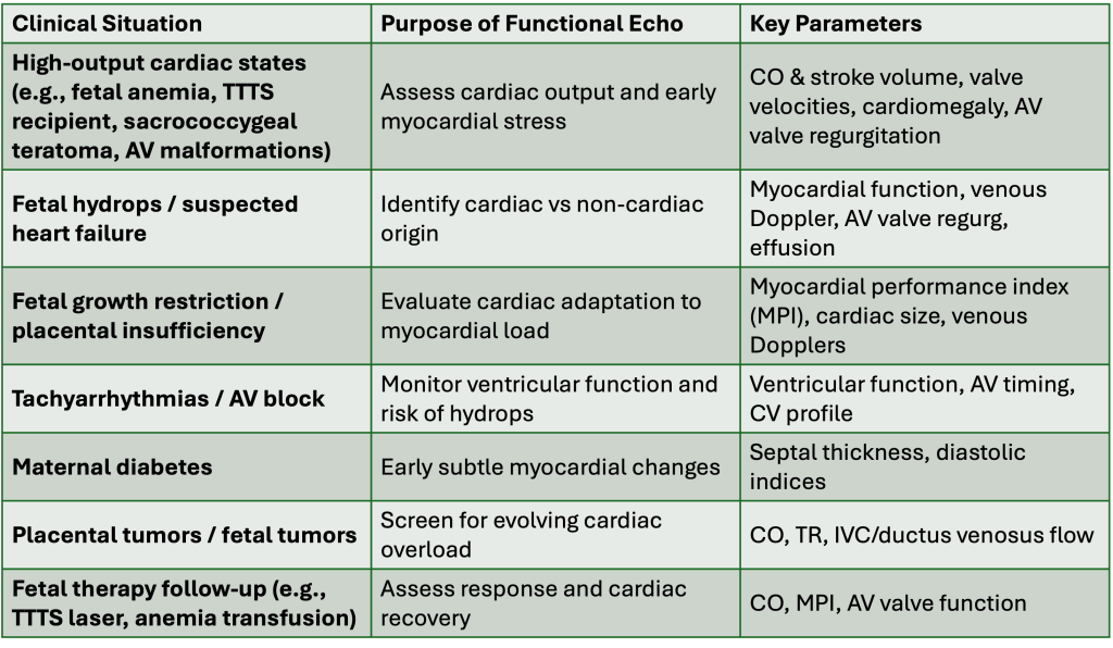 - Functional assessment — cardiac output, ventricular function, MPI, venous/arterial Dopplers, and surveillance for evolving hydrops