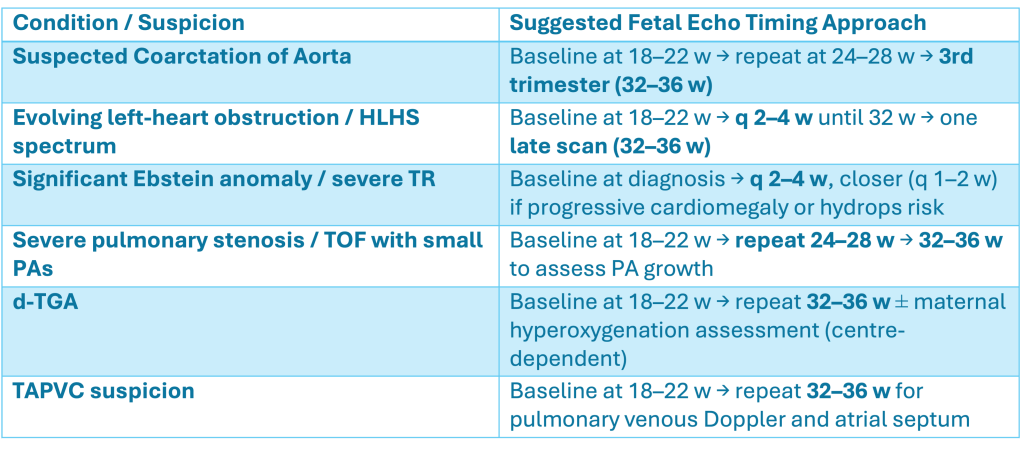 A well-timed fetal echocardiography pathway, anchored on the 18–22-week comprehensive scan, supported by early targeted and transvaginal imaging, and integrated with genetic testing and MTP timelines, ensures that families receive timely, accurate and compassionate care.