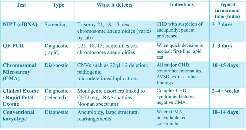 Genetic evaluation plays a major role in the work-up of fetal heart disease. Decision-making is often time-sensitive, so understanding test types and turnaround times helps in planning.