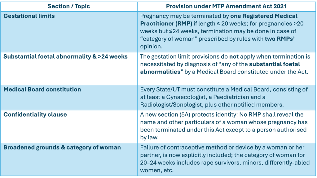 - Upper gestation limit extension: The previous Act allowed termination up to 20 weeks; the Amendment raised it to 24 weeks for defined categories of women.